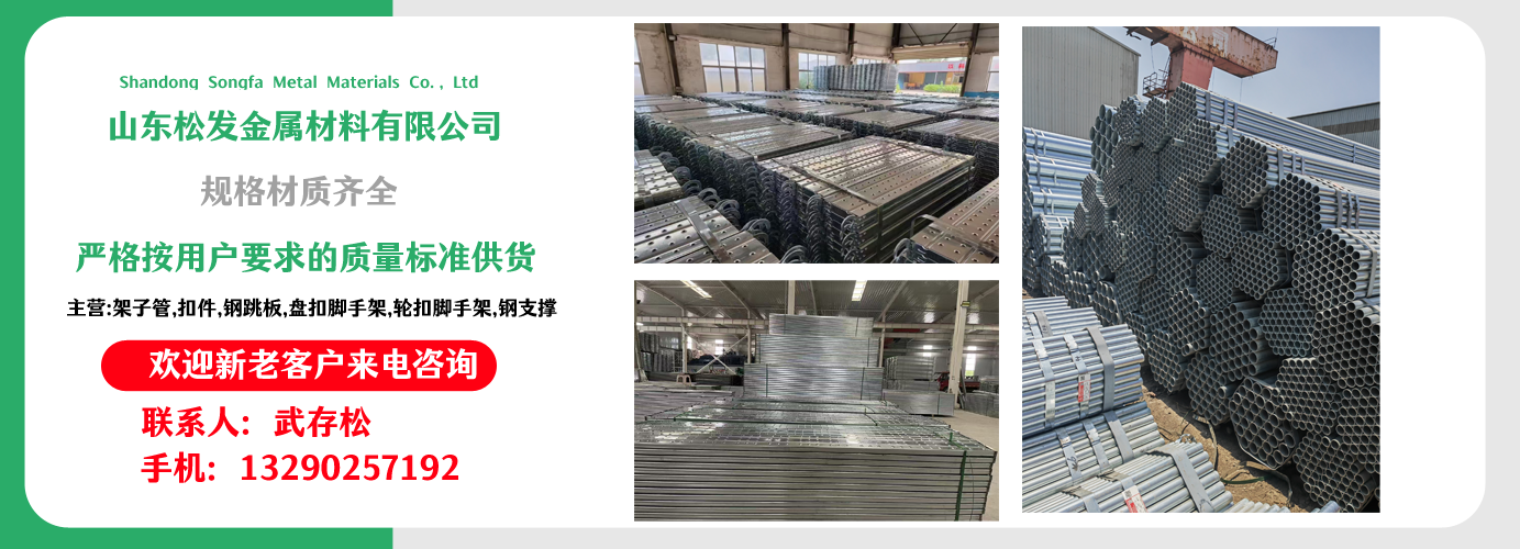 山東松發金屬材料有限公司主營架子管,扣件,鋼跳板,盤扣腳手架,輪扣腳手架,鋼支撐生產廠家。本廠專業生產銷售?! 〗ㄖ眉茏庸?、 主要用于房建,橋梁,鐵路,公路,地鐵,水庫,隧道,支撐。  架子管,扣件,鋼跳板,盤扣腳手架,輪扣腳手架,鋼支撐的優越性及應用“ ”產品因具有結構簡單合理、設計巧妙、使用方便、安全、快捷、易于運輸、儲存、維護簡單等特點。  公司一貫堅持“質量,用戶至上,優質服務,信守合同”的宗旨,憑借著高質量的產品,良好的信譽,優質的服務,產品暢銷全球。歡迎廣大客戶來電洽談,共同發展,共創輝煌!  山東松發金屬材料有限公司秉承誠信服務、恪守信譽的宗旨,在同等的質量下,保證以最低的價格,最完善的服務,最高的信譽來答謝各界朋友的支持和厚愛,歡迎您的來電、咨詢,我們將竭誠為您服務!...